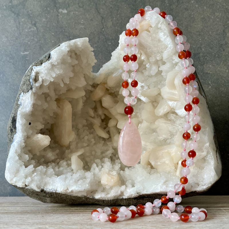 Deze Mala van 6mm Carneool, Rozenkwarts en Maansteen kralen is ontworpen en handgeknoopt in Curly's atelier. Voor de afwerking van de Mala is er een 8mm Carneool kraal gebruikt en een mooie druppelhanger van Rozenkwarts.