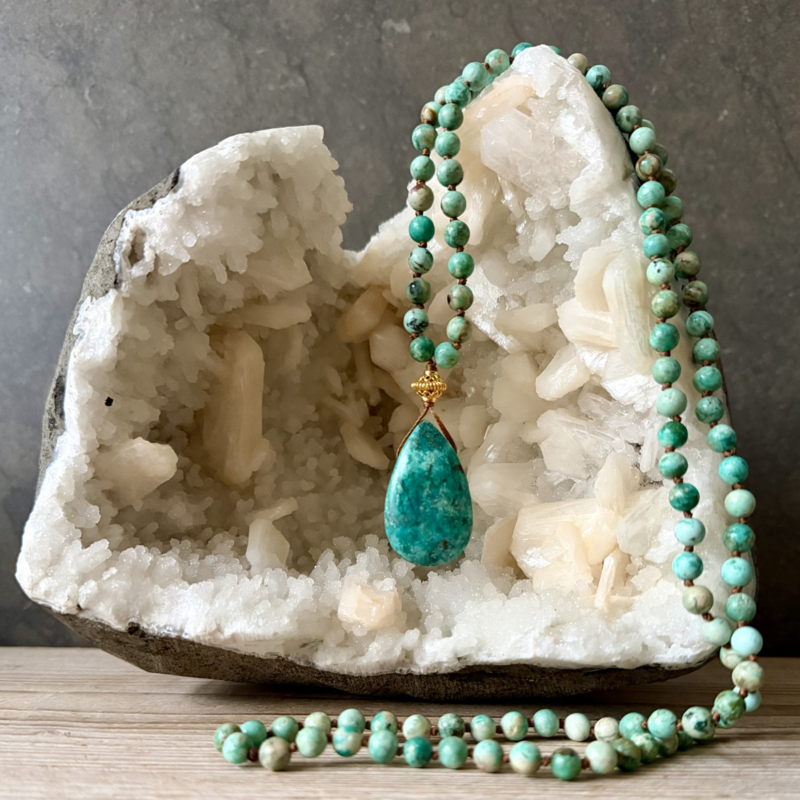 Deze Mala van 6mm Peruviaanse Turkoois kralen is ontworpen en handgeknoopt in Curly's atelier. Voor de afwerking van de Mala is een verguld Sterling zilveren kraal en een Chrysocolla hanger gebruikt.