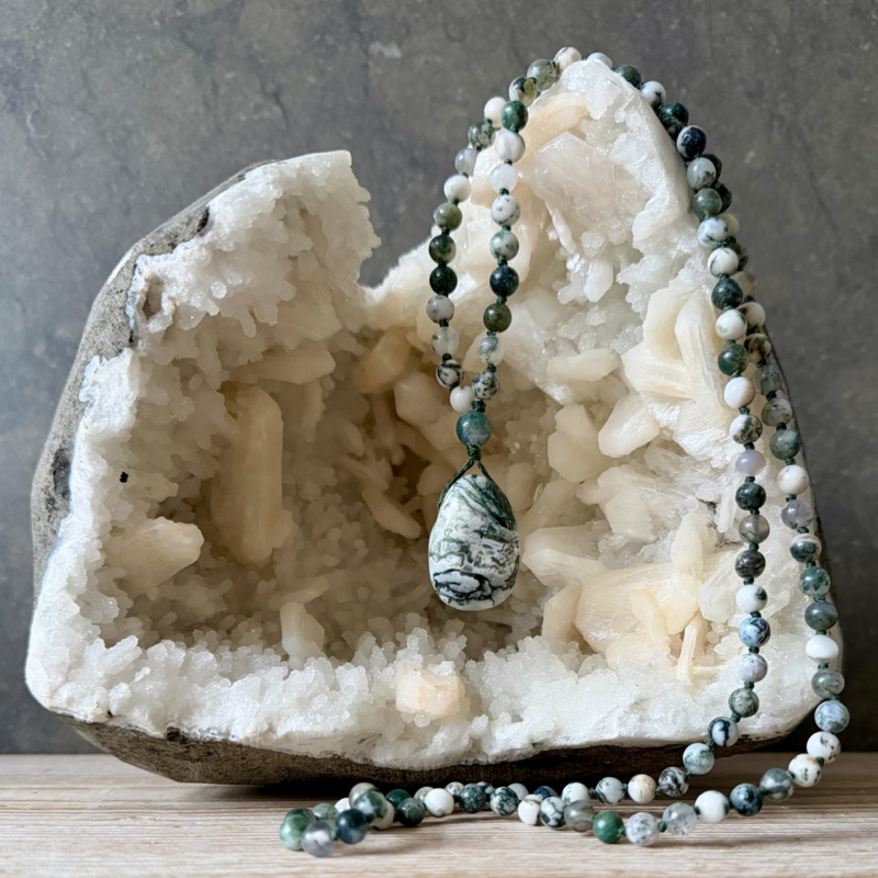 Deze Mala van 6mm Boomagaat kralen is ontworpen en handgeknoopt in Curly's atelier. Voor de afwerking van de Mala is een 8 mm Boomagaat kraal en een Boomagaat hanger gebruikt.