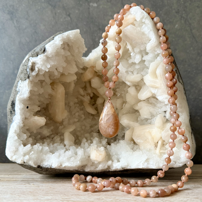 Deze Mala van 6mm Roze Maansteen kralen is ontworpen en handgeknoopt in Curly's atelier. Voor de afwerking van de Mala is er een 8 mm Roze Maansteen kraal gebruikt en een mooie doorboorde hanger van Roze Maansteen.