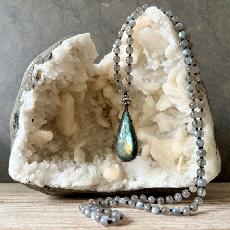 Deze Mala van 6mm Labradoriet kralen is ontworpen en handgeknoopt in Curly's atelier. Voor de afwerking van de Mala is er een Sterling zilveren kraal en een mooie doorboorde hanger van Labradoriet gebruikt.