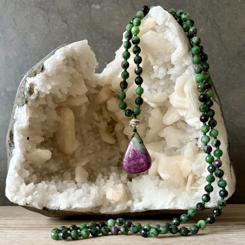 Deze Mala van 6mm gefacetteerde Ruby Zoïsiet kralen is ontworpen en handgeknoopt in Curly's atelier. Voor de afwerking van de Mala is er een 8 mm Sterling zilveren kraal gebruikt en een mooie doorboorde hanger van Ruby Zoïsiet, bijna helemaal van Robijn.😄