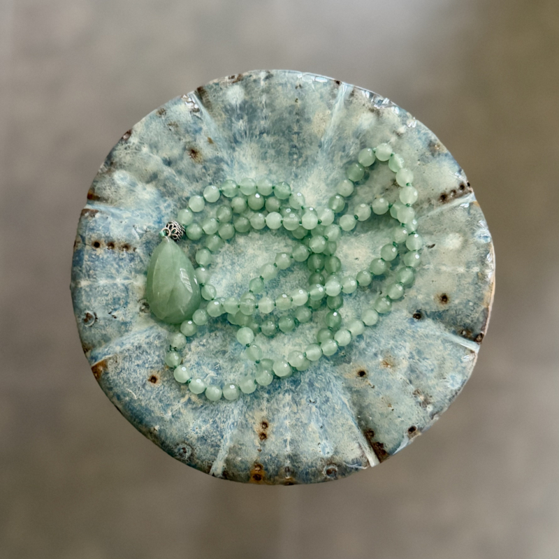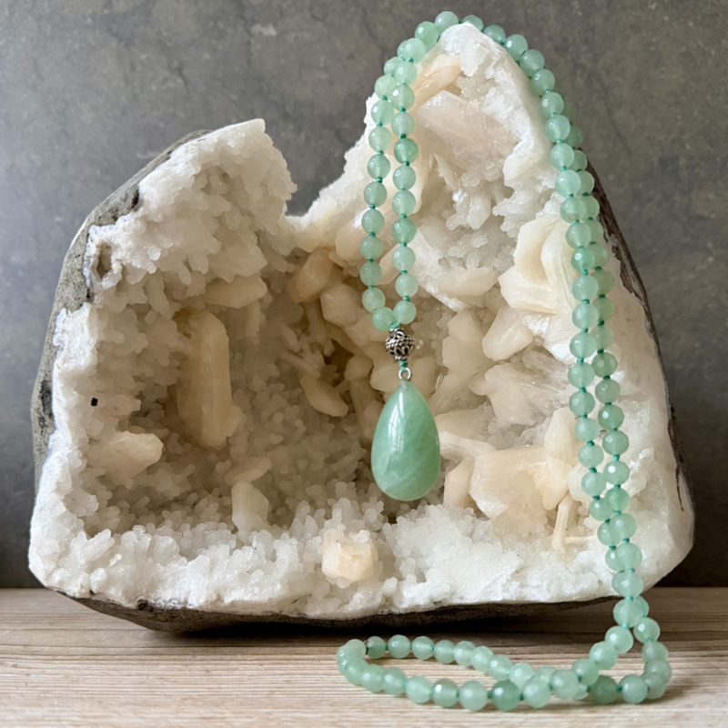 Deze Mala van 6mm gefacetteerde Aventurijn kralen is ontworpen en handgeknoopt in Curly's atelier. Voor de afwerking van de Mala is er een 8 mm Sterling zilveren kraal gebruikt en een mooie druppelhanger van Aventurijn.