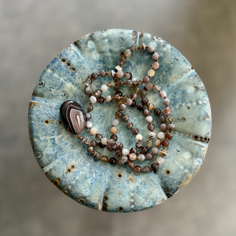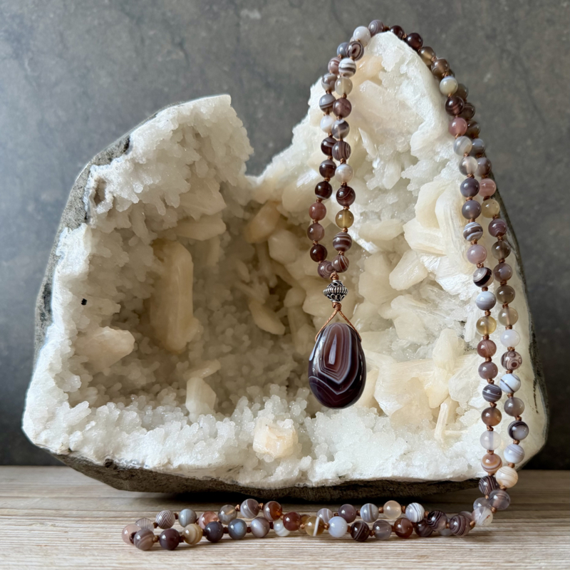 Deze Mala van 6mm Botswana Agaat kralen is ontworpen en handgeknoopt in Curly's atelier. Voor de afwerking van de Mala is er een Sterling zilveren kraal gebruikt en een mooie geboorde druppelhanger van Botswana Agaat.