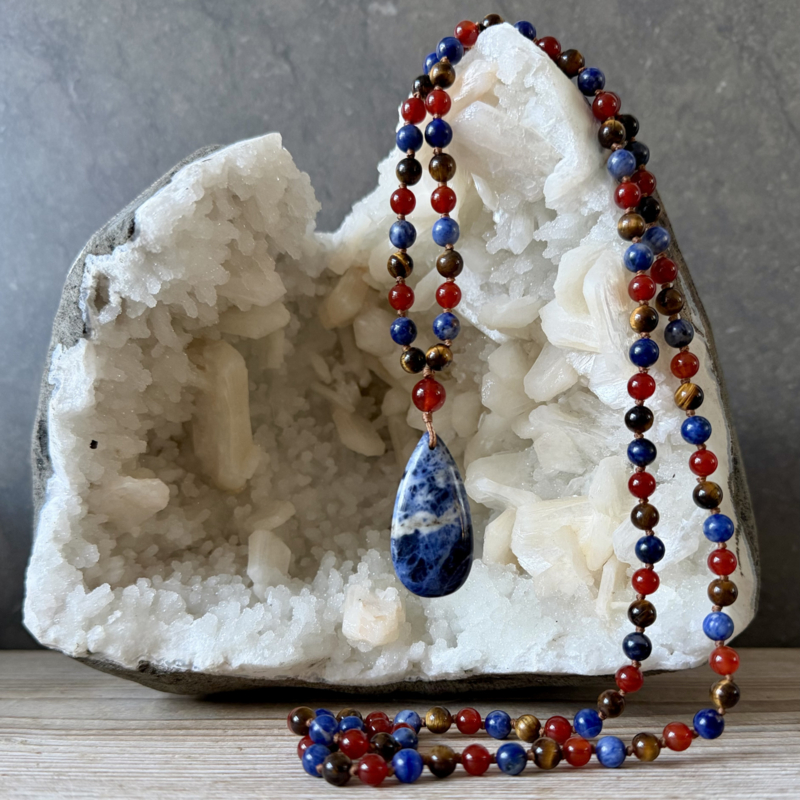 Deze Mala van 6mm Carneool, Sodaliet en Tijgeroog kralen is ontworpen en handgeknoopt in Curly's atelier. Voor de afwerking van de Mala is er een 8mm Carneool kraal gebruikt en een mooie hanger van Sodaliet.