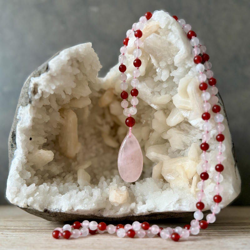 Deze Mala van 6mm Carneool, Rozenkwarts en Maansteen kralen is ontworpen en handgeknoopt in Curly's atelier. Voor de afwerking van de Mala is er een 8mm Carneool kraal gebruikt en een mooie druppelhanger van Rozenkwarts.