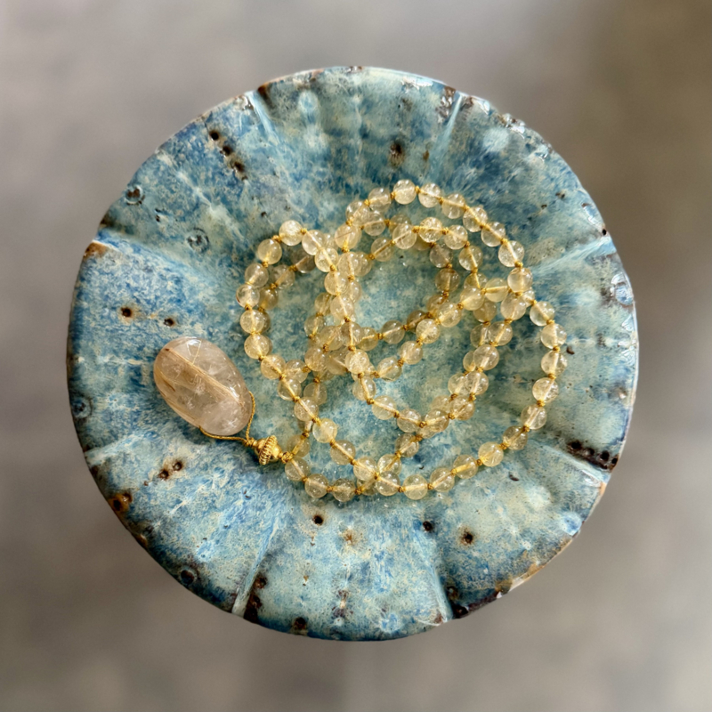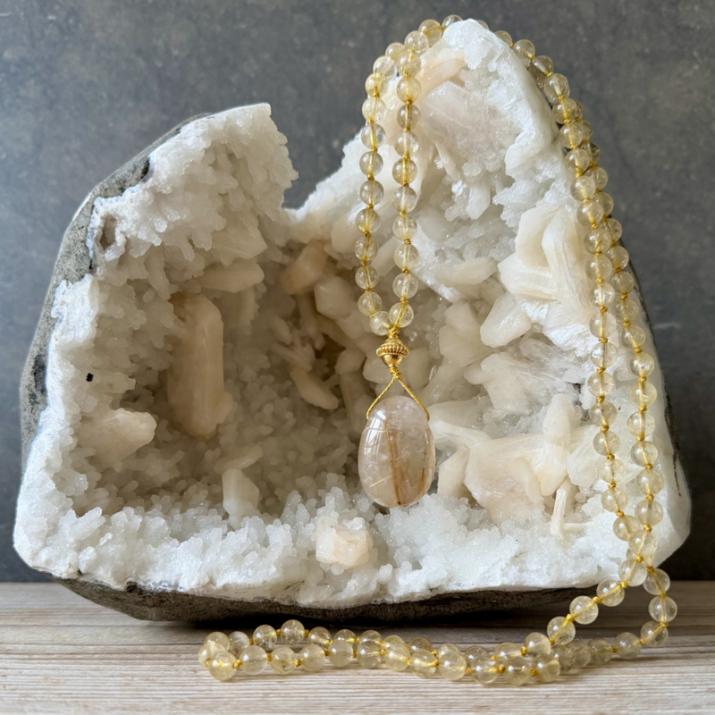 Deze Mala van 6mm ronde Rutielkwarts kralen is ontworpen en handgeknoopt in Curly's atelier. Voor de afwerking van de Mala is er een Verguld Sterling zilveren kraal en een mooie doorboorde Rutielkwarts hanger gebruikt.