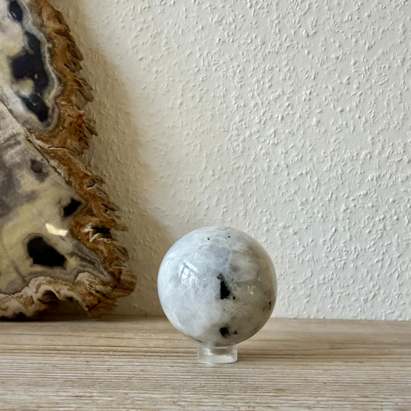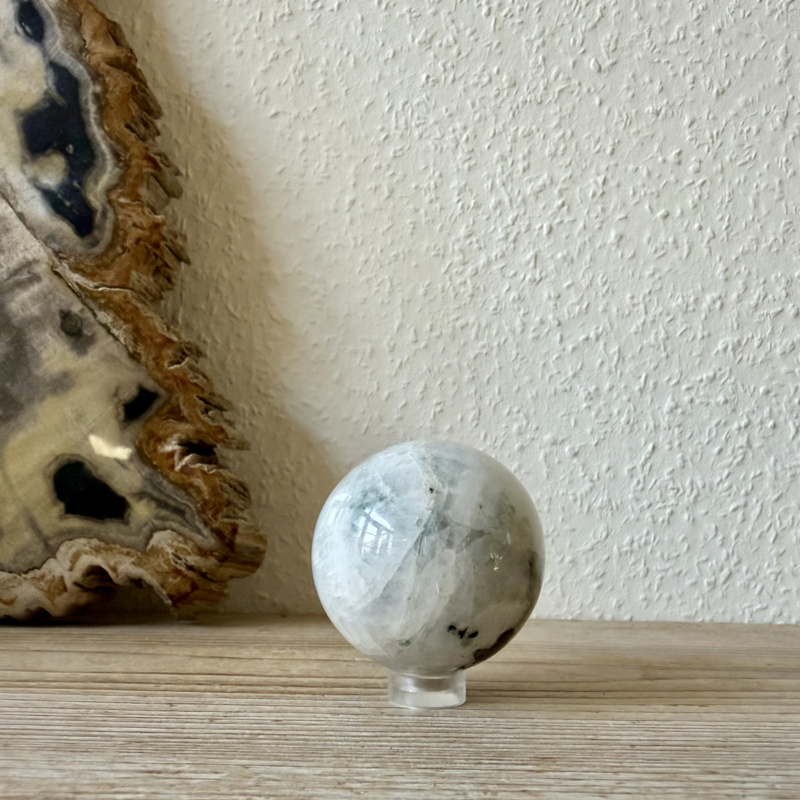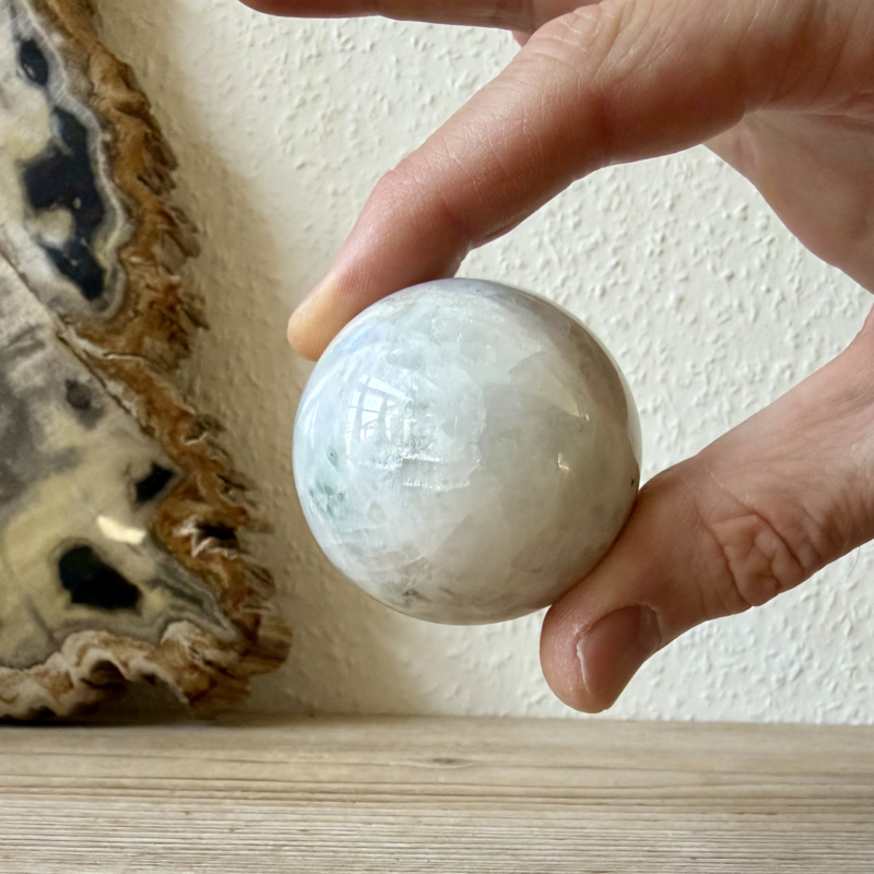 Prachtige Regenboog Maansteen bol uit India. Je krijgt de bol van de foto.