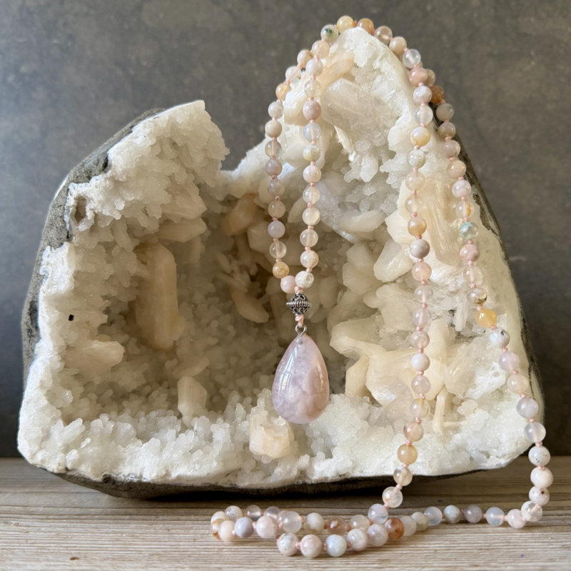 Deze Mala van 6mm Flower Agaat (bloem agaat) kralen is ontworpen en handgeknoopt in Curly's atelier. Voor de afwerking van de Mala is er Sterling zilveren kraal en een mooie hanger van Flower Agaat gebruikt.