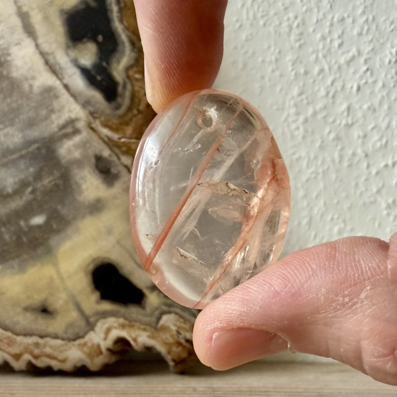 Prachtige handgeslepen Hematoïde Kwarts hanger uit Madagascar. De hangers hebben een gat van ca. 2 mm. Geschikt voor een Sterling zilveren cliphanger.