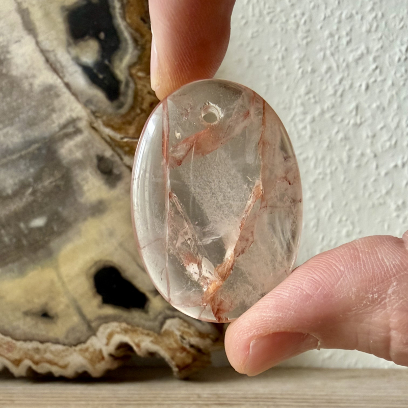 Prachtige handgeslepen Hematoïde Kwarts hanger uit Madagascar. De hangers hebben een gat van ca. 2 mm. Geschikt voor een Sterling zilveren cliphanger.