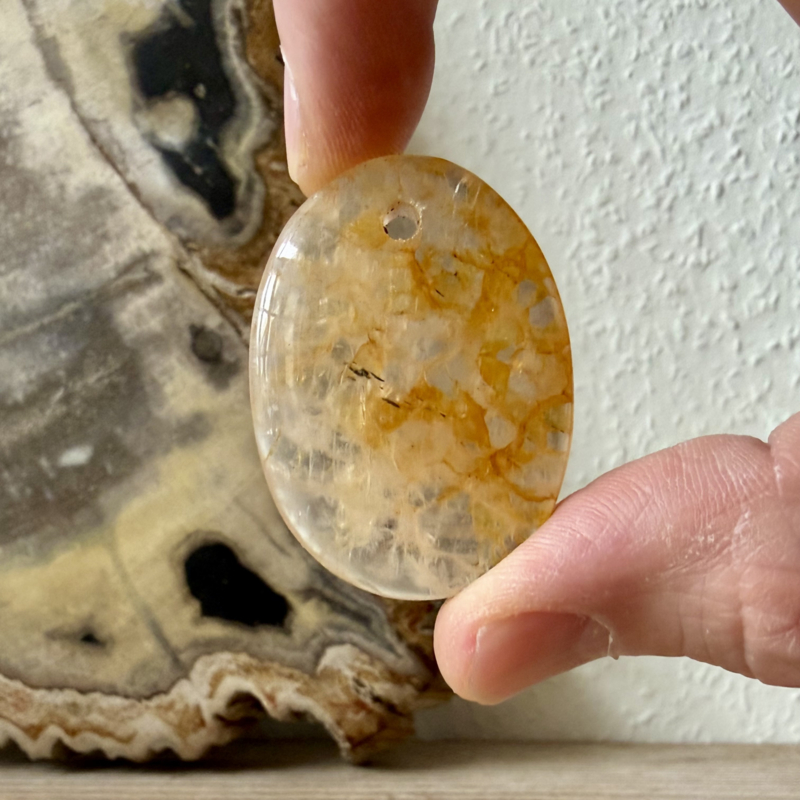 Prachtige handgeslepen Limoniet hangers uit Madagascar. De hangers hebben een gat van ca, 2 mm. Geschikt voor een Sterling zilveren cliphanger. Je krijgt het exemplaar van de foto.