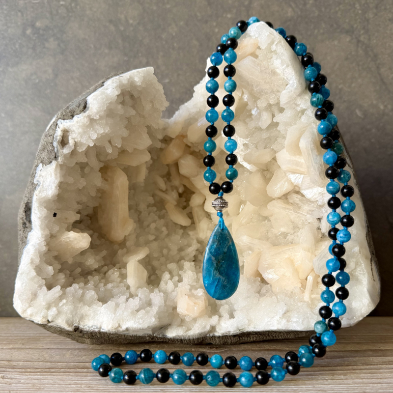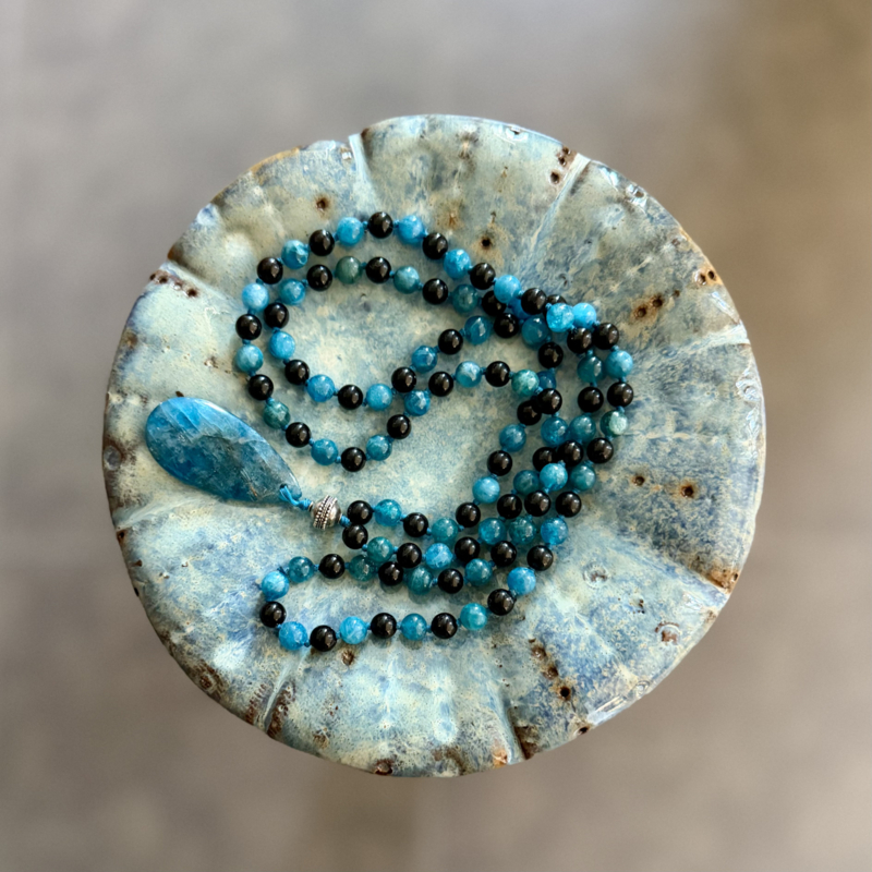 Deze Mala van 6mm Apatiet en Zwarte Toermlijn kralen is ontworpen en handgeknoopt in Curly's atelier. Voor de afwerking van de Mala is er een 8 mm Sterling zilveren kraal gebruikt en een mooie hanger van Apatiet.