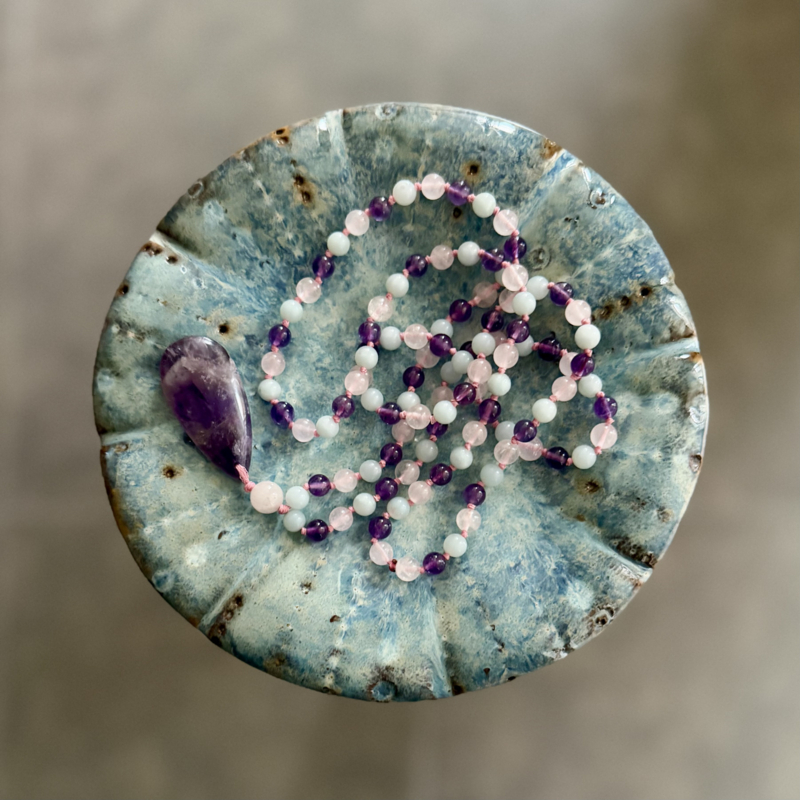 Amazoniet-Rozenkwarts-Amethist MalaDeze Mala van 6mm Amazoniet, Rozenkwarts en Amethist kralen is ontworpen en handgeknoopt in Curly's atelier. Voor de afwerking van de Mala is er een 8mm Rozenkwarts kraal gebruikt en een mooie hanger van Amethist.