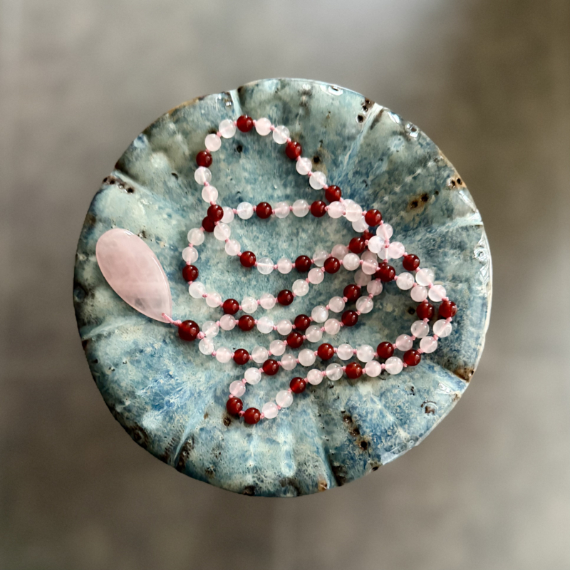 Rozenkwarts-Regenboog Maansteen-Carneool malaDeze Mala van 6mm Carneool, Rozenkwarts en Maansteen kralen is ontworpen en handgeknoopt in Curly's atelier. Voor de afwerking van de Mala is er een 8mm Carneool kraal gebruikt en een mooie druppelhanger van Rozenkwarts.